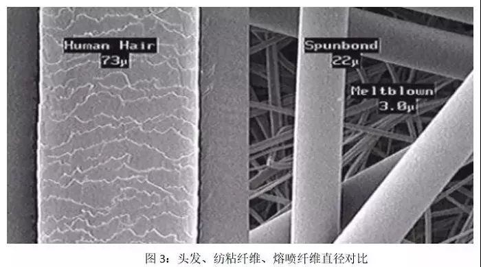 為了更能說明問題,我們將紡粘層S纖維,熔噴層M纖維和頭發做一個對比圖如下,頭發直徑的1/3,接近紡粘層纖維,而頭發直徑的1/30,和熔噴層M纖維直徑接近了,當然,研發人員還在開發更細的纖維,來保證更好的抗菌阻隔性。